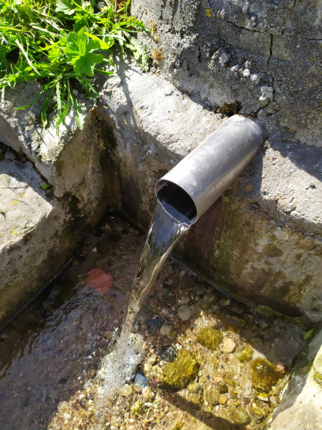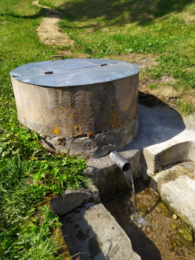 Родник каптирован железобетонным кольцом с выводом воды через трубу. Каптаж был изготовлен жителями соседних домов.