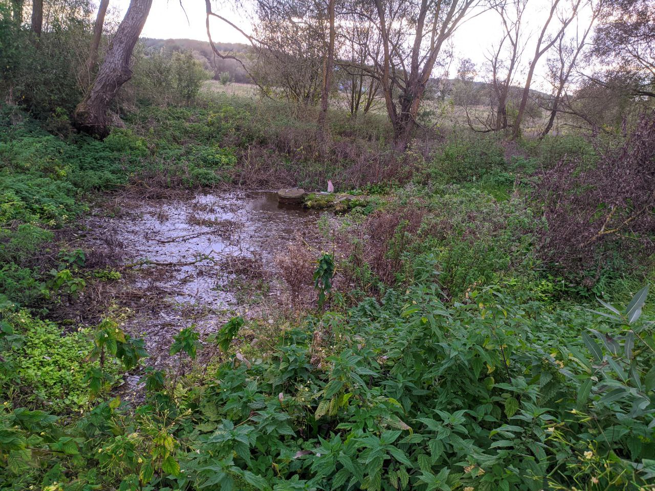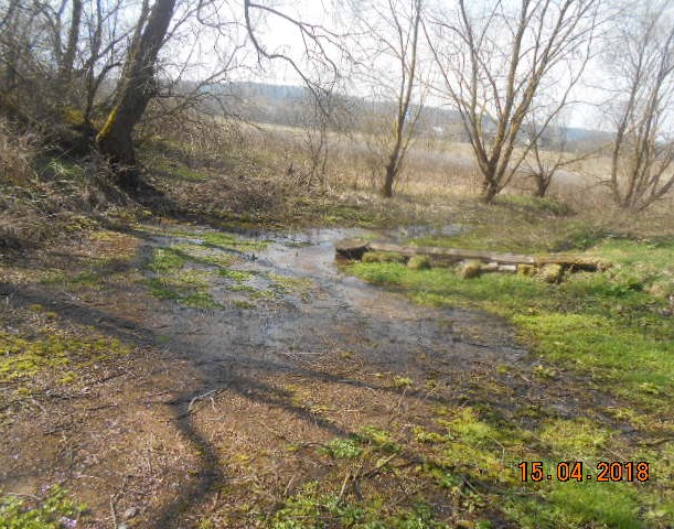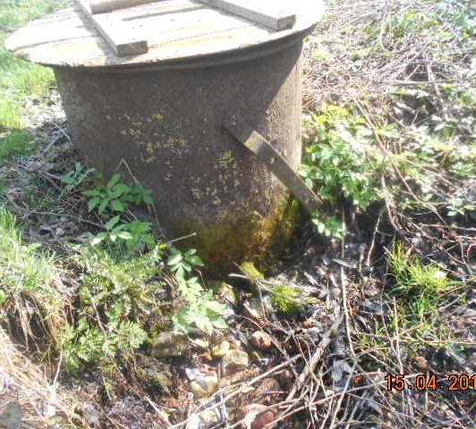 К роднику над топким местом уложен деревянный настил. Над родником установлены железные кольца, одно накрыто деревянной крышкой, а другое жестяной. Вода отводится через трубу.