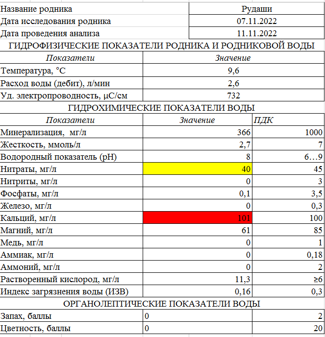 По анализу воды в роднике содержится близкий к превышению уровень нитратов (40 мг/л при норме до 45). Такую воду нежелательно употреблять длительно. Также вода имеет слегка повышенный уровень жесткости (2,7 ммоль/л).