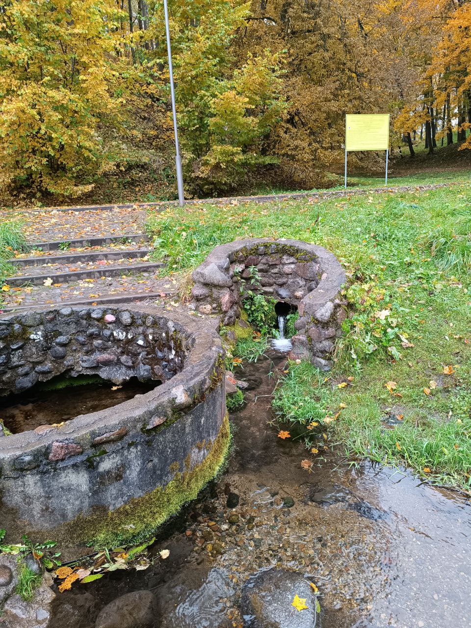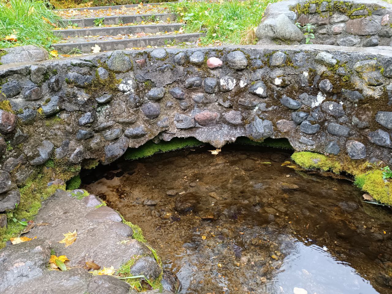 Родник выполнен в виде колодца, обложенного камнями. Рядом, казалось бы, другой выход воды, но это слив воды из фонтана. Родниковый ручей впадает в пруд на р. Гайна.