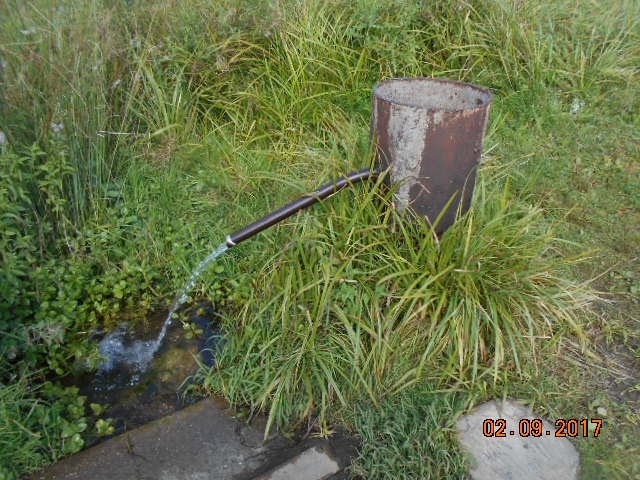 Родник каптирован с выводом воды через трубу. Здесь воду не берут, потому что в трубе водоросли. Вода имеет повышеную жесткость, а также речной привкус. Дебит родника довольно сильный.