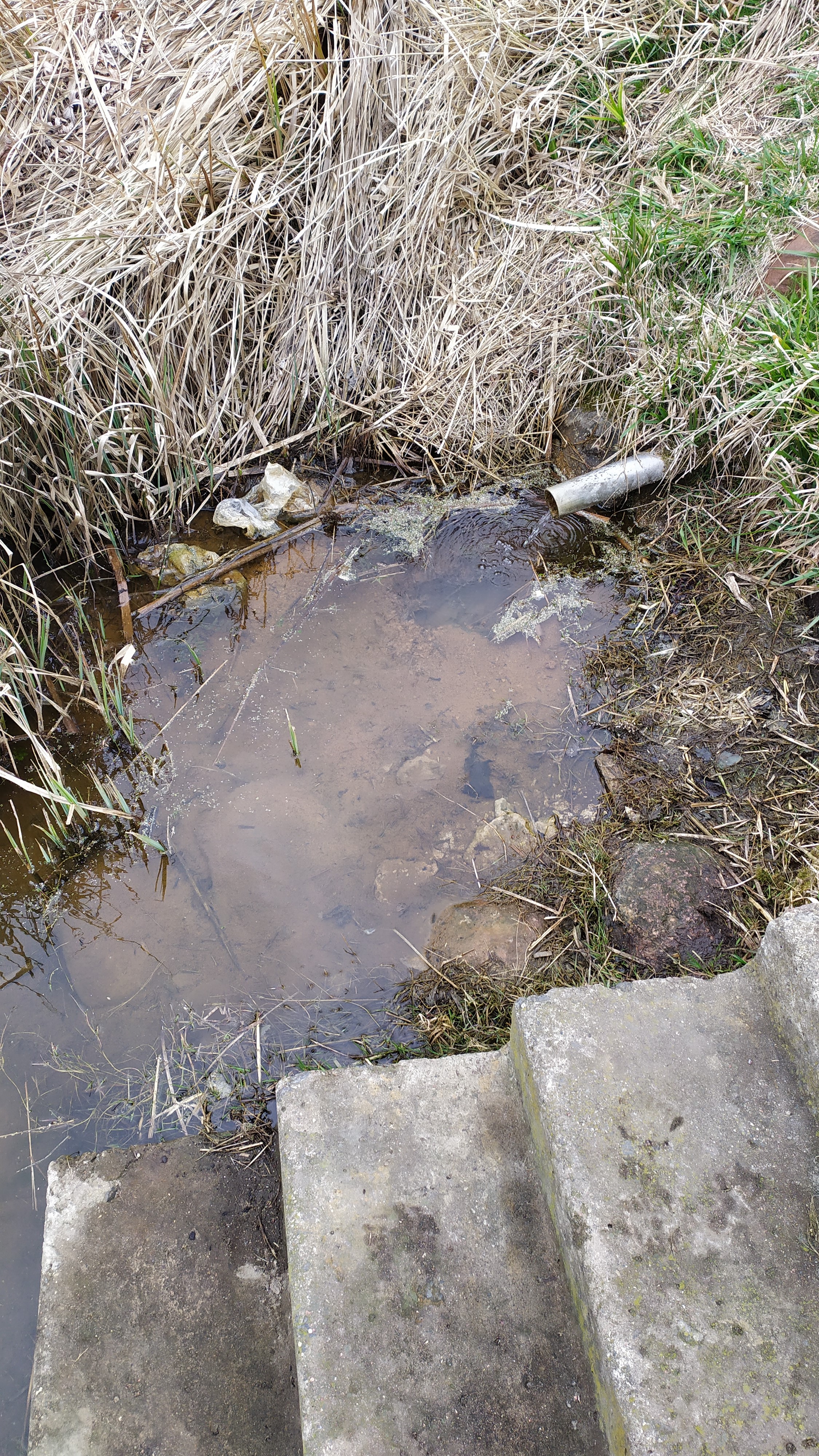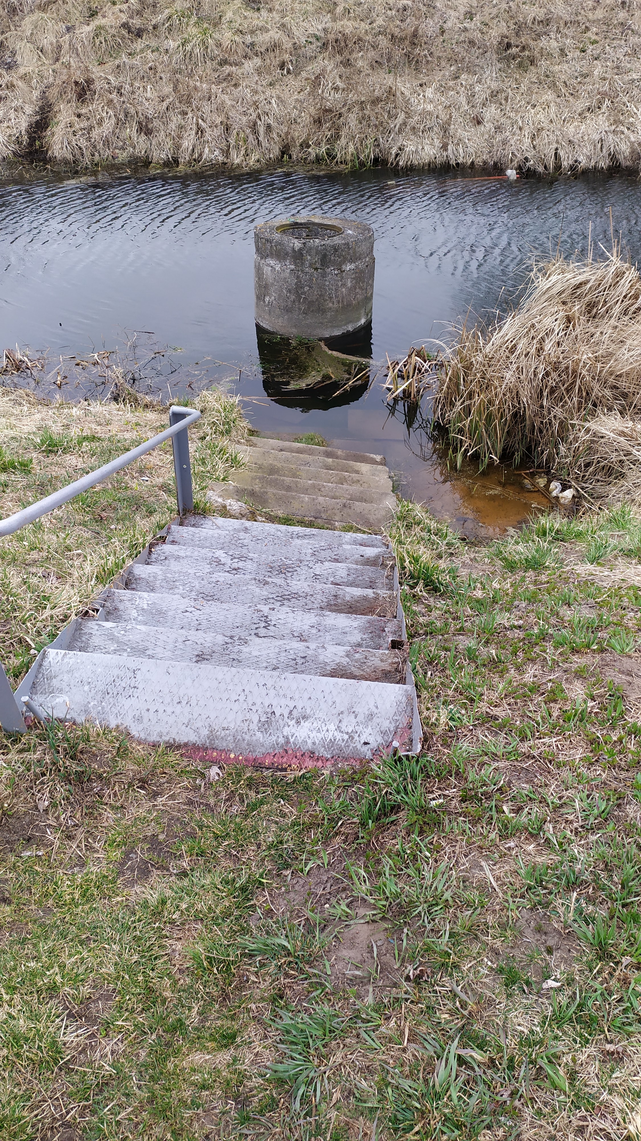 В воде канала находится железобетонное кольцо. Скорее всего, родник раньше находился там, т.к. часть бетонных ступенек затоплена, либо это было собирающее кольцо.